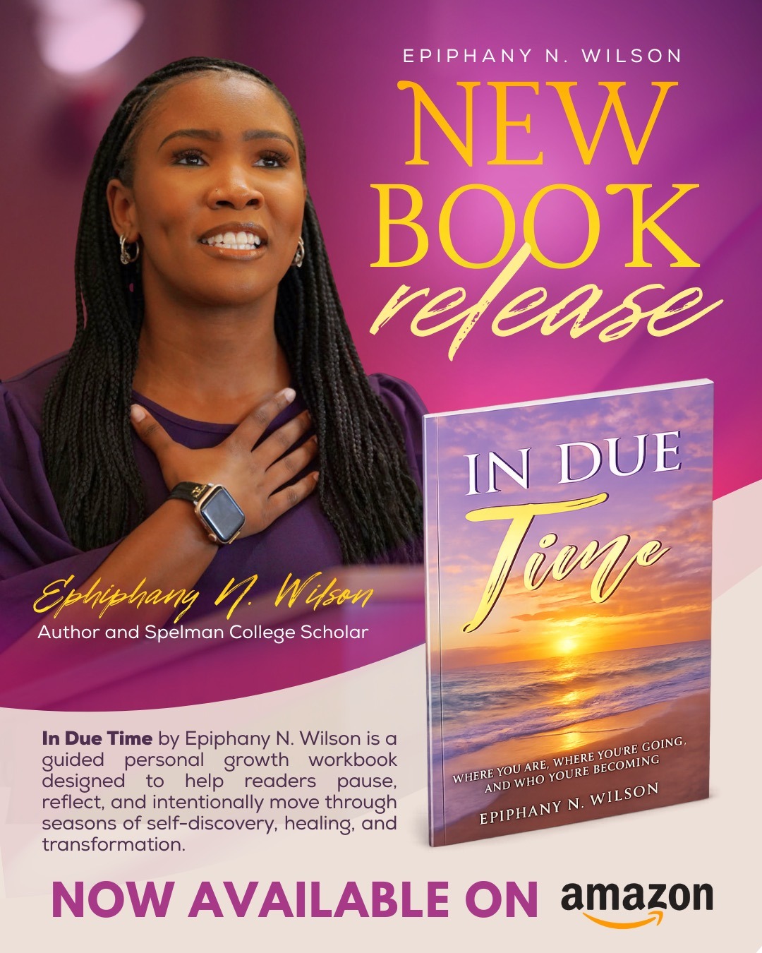 As part of her broader vision to engage with the public and healthcare professionals, Epiphany Wilson is an author, with two books that offer personal insights into her work and philosophy. Her first journal, In Due Time: Where You Are, Where You’re Going, And Who You’re Becoming, invites readers to explore their own journeys, encouraging reflection and growth along the way. Available on Amazon, it has resonated with individuals looking for a deeper connection to their own paths in life.